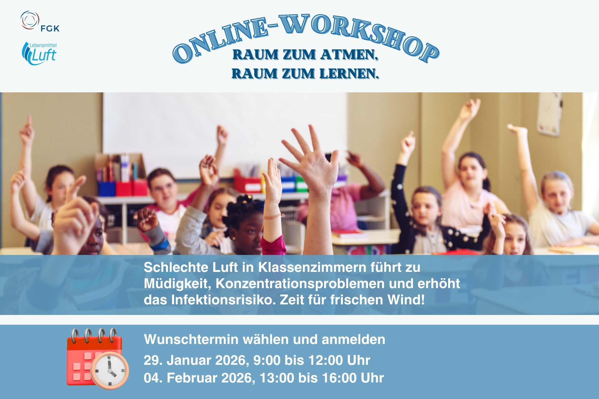 Die Veranstaltung findet an zwei Terminen statt: am 29. Januar 2026 von 9 bis 12 Uhr und am 4. Februar 2026 von 13 bis 16 Uhr. Sie richtet sich insbesondere an Mitarbeitende von Planungsbüros, Schulträgern oder Behörden und wird für die Verlängerung der Eintragung in der Energieeffizienz-Expertenliste angerechnet. Weitere Informationen, das Programm und den Anmeldelink zu den Online-Workshops „Raum zum Atmen, Raum zum Lernen“ 2026 finden Sie auf www.fgk.de unter „Veranstaltungen“.